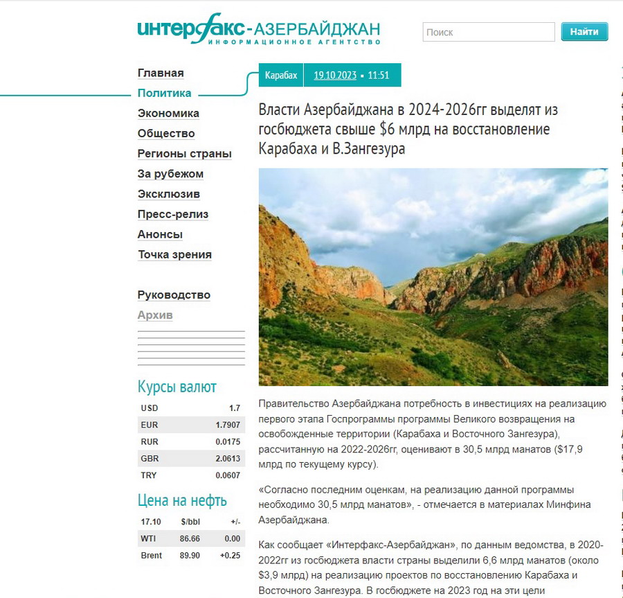 Ըստ հաղորդագրության՝ 2020-2022 թվականներին երկրի իշխանությունները մոտ 3,9 միլիարդ դոլար են հատկացրել՝ Ղարաբաղի և «Արևելյան Զանգեզուրի» վերականգնման ծրագրերի իրականացման համար։