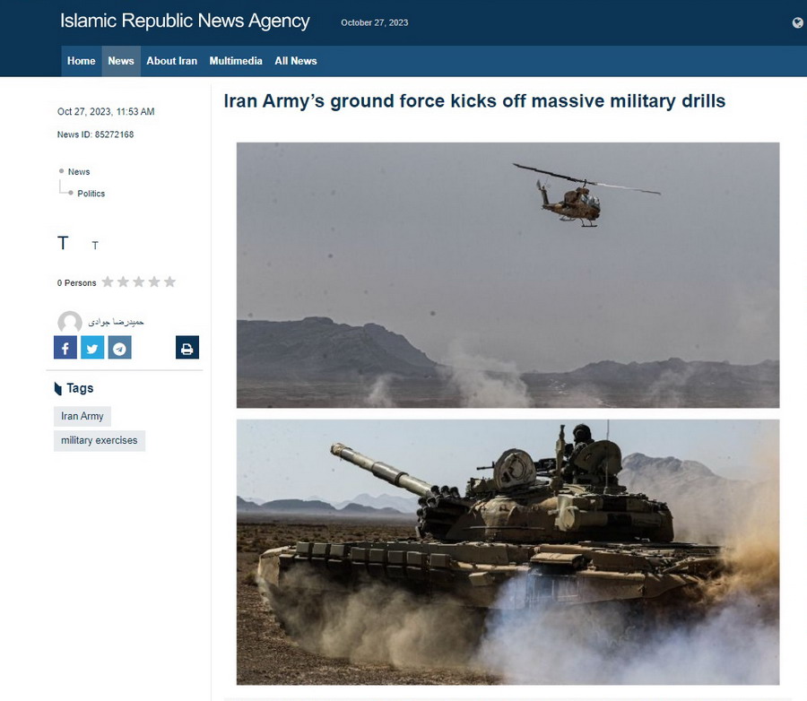Իրանի բանակի ցամաքային ուժերը լայնածավալ զորավարժություններ են սկսել, որոնց նպատակն է զորամասերի մարտունակության գնահատումը, ինչպես նաև նոր զինատեսակների փորձարկումը, դիմագրավումը հնարավոր սպառնալիքներին: