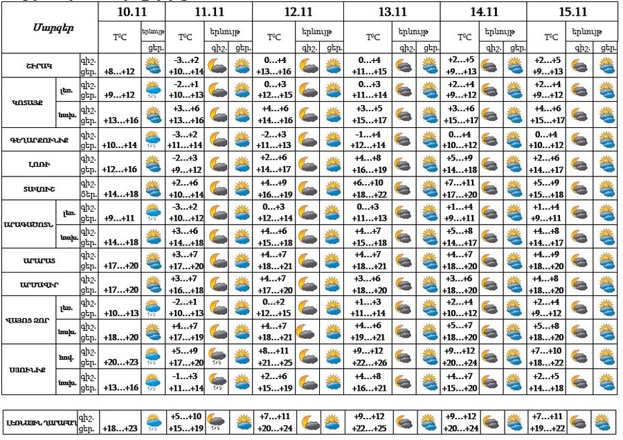 Նոյեմբերի 10-ին կեսօրից հետո, 11-ի գիշերն առանձին շրջաններում սպասվում են տեղումներ, առանձին լեռնային հատվածներում՝ թաց ձյուն։ Նոյեմբերի 12-15-ին սպասվում է առանց տեղումների եղանակ։