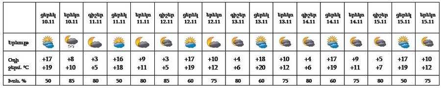 Նոյեմբերի 10-ին կեսօրից հետո հնարավոր է կարճատև անձրև։ Նոյեմբերի 11-15-ին սպասվում է առանց տեղումների եղանակ։