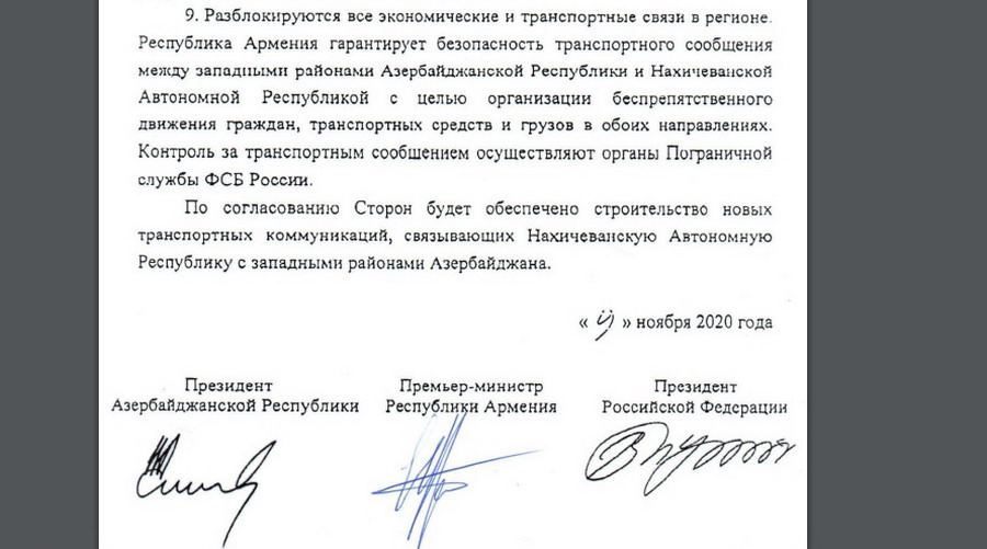 2020-ի նոյեմբերի 9-ի հայտարարության 9-րդ կետում բառացիորեն նշվում է. «Հայաստանի Հանրապետությունը երաշխավորում է Ադրբեջանի Հանրապետության արևմտյան շրջանների և Նախիջևանի Ինքնավար Հանրապետության միջև տրանսպորտային հաղորդակցության անվտանգությունը՝ քաղաքացիների, տրանսպորտային միջոցների և բեռների՝ երկու ուղղություններով անխոչընդոտ տեղաշարժը կազմակերպելու նպատակով: Տրանսպորտային հաղորդակցության նկատմամբ վերահսկողությունն իրականացնում են Ռուսաստանի ԱԴԾ սահմանապահ ծառայության մարմինները»: