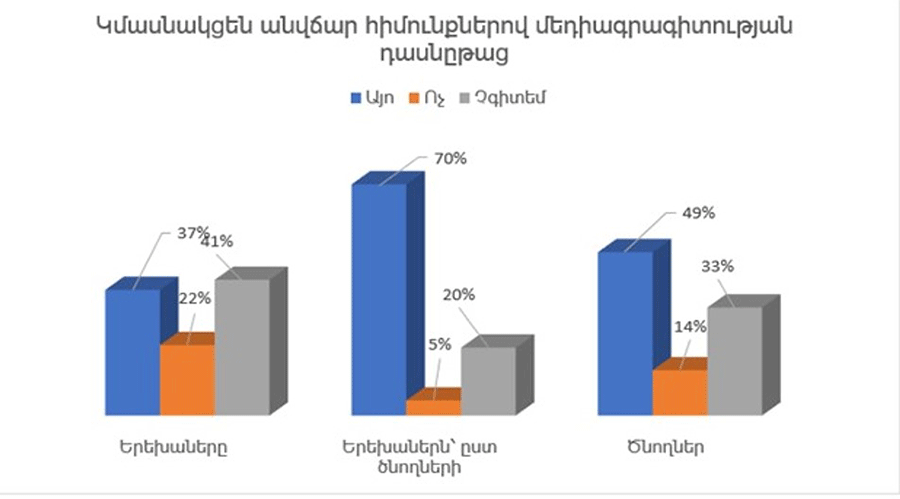 Հարցումն իրականացվել է տպագիր հարցաթերթերի միջոցով, այնուհետև անցկացվել են 8-12 հոգանոց ֆոկուս խմբային քննարկումներ նախ ծնողների, հետո երեխաների հետ։ Հարցման մասնակիցների մեծամասնությունը, թեև ունի մեդիագրագիտության կարողությունների բարելավման անհրաժեշտություն, սակայն հարցին՝ եթե տեղեկանաք, որ կազմակերպվում է մեդիագրագիտության դասընթաց անվճար հիմունքներով, ապա կցանկանա՞ք մասնակցել, երեխաների 37%-ն է դրական պատասխանել, ծնողների՝ 49%-ը, երեխաների 22%-ը չի մասնակցի մեդիագրագիտության անվճար դասընթացի, իսկ ծնողների՝ 14%-ը։ Երեխաների 41 %-ը չգիտի՝ կմասնակցի՞, թե՝ ոչ։ Պատկերը մտահոգիչ է թերևս այն պատճառով, որ հարցմանը մասնակցած երեխաների մեծամասնությունը չի մասնակցել մեդիագրագիտության դասի, բայց նաև չի էլ ցանկանում մասնակցել։