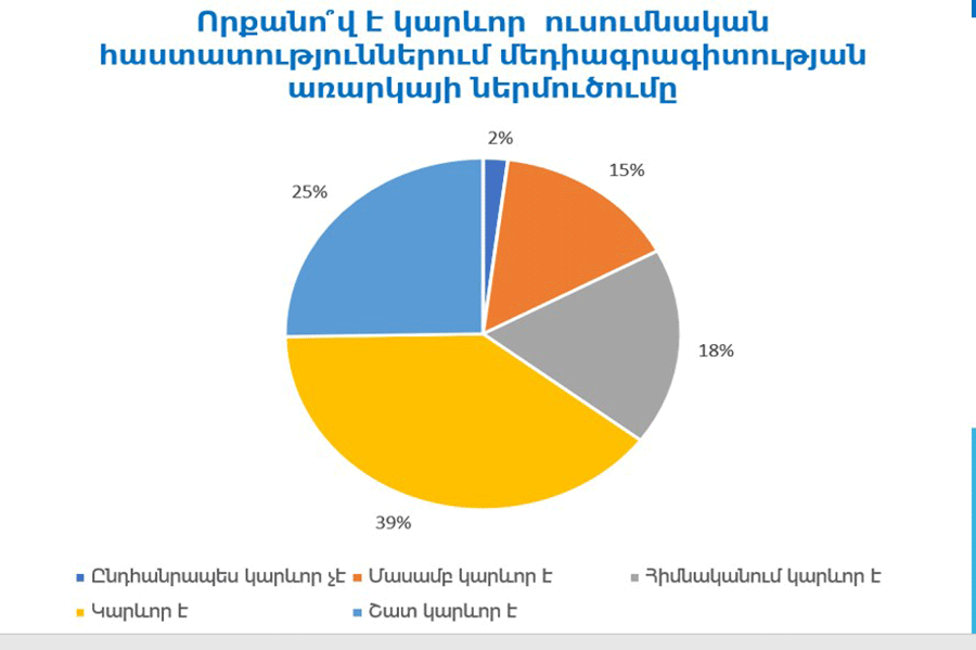 Իսկ մեդիագրագիտություն առարկայի ներմուծումը կրթական ծրագրեր ավելի արդյունավետ կլինի՞, որովհետև հարցման մասնակիցների մեծամասնությունը, կարծում է, որ կարիք չկա առանձին առարկա ներմուծել և ծանրաբեռնված ծրագրերն էլ ավելի չծանրաբեռնել, Սերոբ Խաչատրյանը պատասխանեց․ «Հանրակրթության պետական նոր չափորոշիչում ութ կարողունակություններից մեկը կոչվում է թվային և մեդիագրագիտության կարողունակություն, այսինքն՝ մեր նախարարությունն արդեն որպես կրթության վերջնարդյունք տեսնում է մեդիակարողունակությունը որպես համընդհանուր պահանջ բոլոր դպրոցներից։ Այնպես որ այդ ամենը տարալուծված է մի քանի առարկաների մեջ։ Դա լավագույն ձևն է, որովհետև այս պահին առանձին առարկա մտցնելու անհրաժեշտություն չկա»։