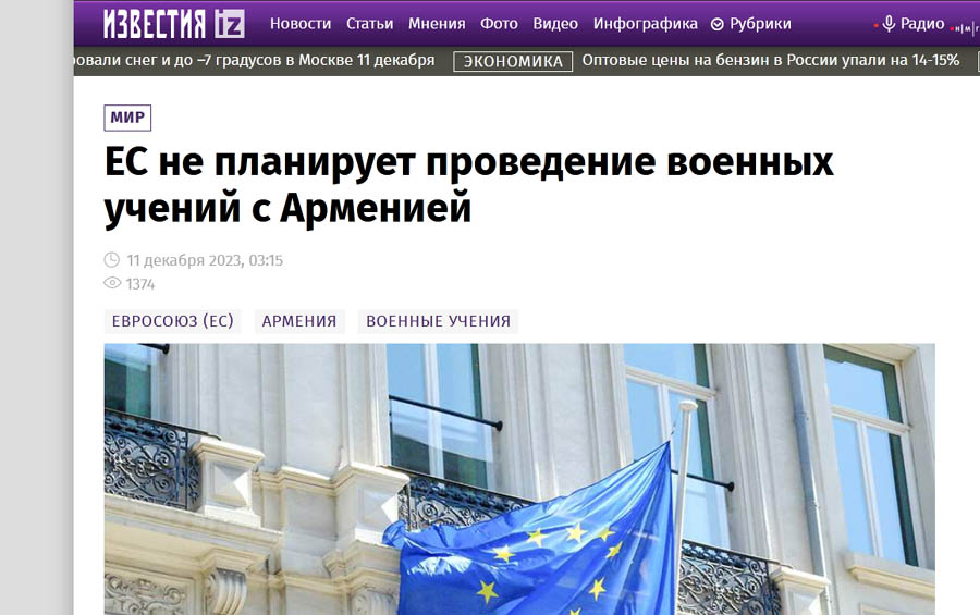 ԵՄ-ն չի պատրաստվում Հայաստանի հետ համատեղ զորավարժություններ անցկացնել, «Իզվեստիային» ասել է ԵՄ արտաքին քաղաքական ծառայության ներկայացուցիչ Պետեր Ստանոն: