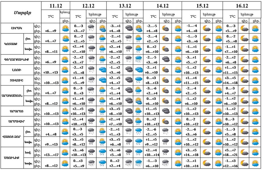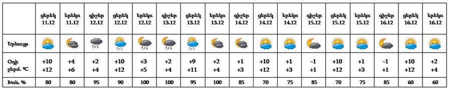 Դեկտեմբերի 11-ի ցերեկը, 14-16-ին սպասվում է առանց տեղումների եղանակ։ Դեկտեմբերի 12-13-ին սպասվում է կարճատև անձրև։