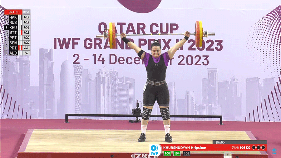 Քաթարի մայրաքաղաքում ընթացող ծանրամարտի օլիմպիական վարկանիշային կարգավիճակ ունեցող Գրան Պրի մրցաշարում Հայաստանի կանանց ազգային հավաքականի անդամ Հռիփսիմե Խուրշուդյանը 87 կգ քաշային կարգում երկամարտում արձանագրեց 232 կգ եւ նվաճեց չեմպիոնի կոչումը՝ միեւնույն ժամանակ արժանանալով նաեւ երկու փոքր արծաթի պոկում եւ հրում վարժություններում։
