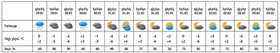 Հունվարի 29-ի ցերեկը, 30-ին հնարավոր է թույլ ձյուն։ Հունվարի 31-ին, փետրվարի 1-3-ին սպասվում է առանց տեղումների եղանակ: