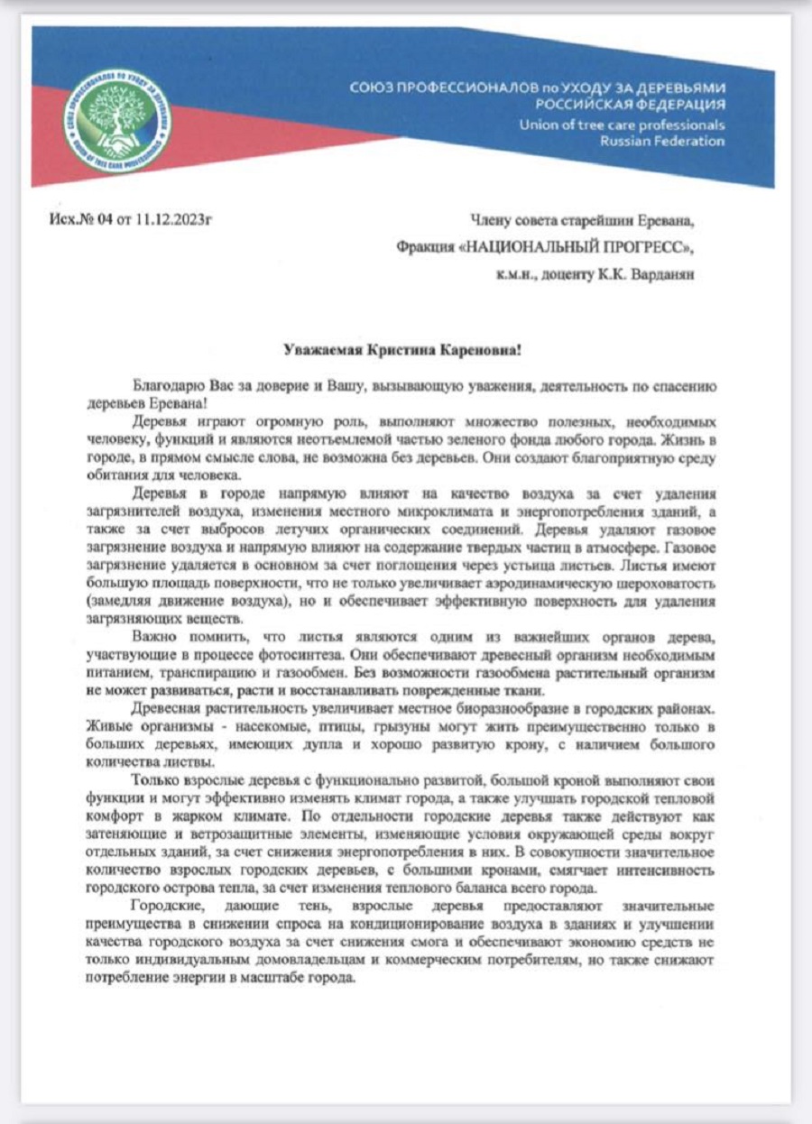 Հաշվի առնելով այս աղետալի վիճակը՝ ես՝ որպես ավագանու անդամ մեր խմբակցության անունից նամակով դիմեցի Արբորիստների եվրոպական ասոցիացիայի արտոնագրման պետական քննական հանձնաժողովի նախագահ, «Առողջ անտառ» ծառերի խնամքի միջազգային դպրոցի հիմնադիր, Ծառերի խնամքի պրոֆեսիոնալների միության նախագահ, գ.գ.թ. Ս․ Բ․ Պալչիկովին՝ խնդրելով պարզաբանել էտի այն ձևը, որն իրականացվում է մայրաքաղաքում։