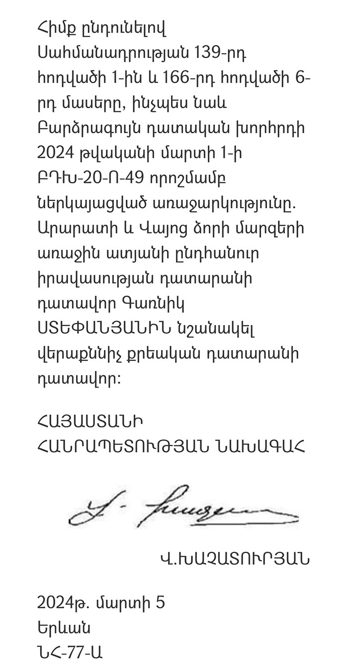 «Ավտովթարի արդյունքում մահացած զինծառայողի հայրը դիմելուց հետո արդեն 5 օրվա ընթացքում այդպես էլ ընդունելության չարժանացավ Բարձրագույն դատական խորհրդի նախագահ Կարեն Անդրեասյանի կամ ԲԴԽ որևէ աշխատակցի կողմից, մարդիկ ժամանակ չունեին։ ՀՀ քաղաքացու դիմումով արտահայտված խնդրանքը շատ պարզ էր՝ որդու մահվան վերաբերյալ քրեական գործը քննող դատավորին ՀՀ վերաքննիչ քրեական դատարանի դատավոր նշանակելու մասին առաջարկությունը ՀՀ նախագահին ներկայացնել ս/թ մարտի 12-ից հետո, քանի որ նշված օրը՝ պաշտպանական կողմի ճառով ավարտվելու էր արդեն 3 տարի տևող գործի քննությունը, իսկ նոր դատավորի պարագայում այն վերսկսվելու է և միանշանակ լրանալու են ամբաստանյալին քրեական պատասխանատվության ենթարկելու վաղեմության ժամկետները։