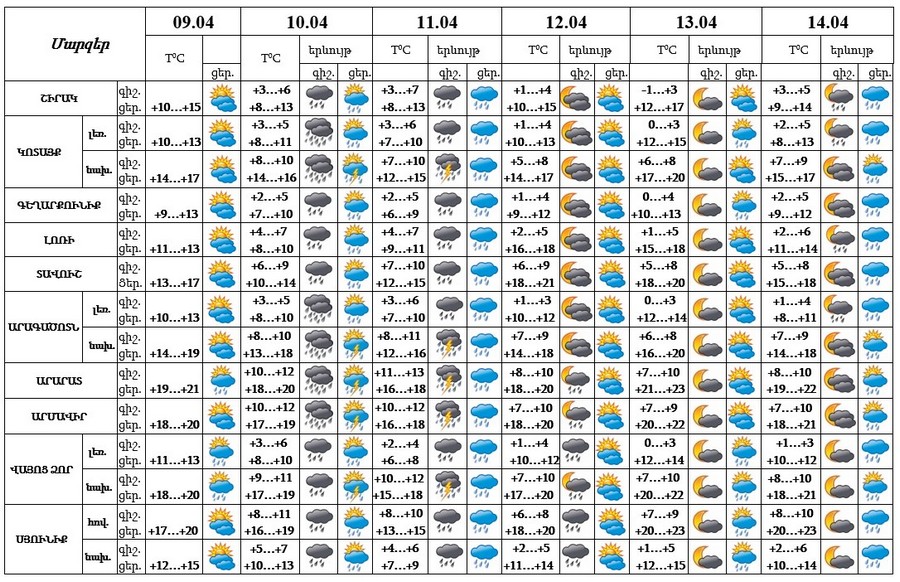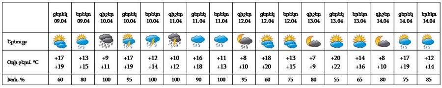 Ապրիլի 9-ի երեկոյան ժամերին, 12-ի գիշերը, 14-ի ցերեկը սպասվում է կարճատև անձրև։ Ապրիլի 10-11-ին սպասվում է անձրև, հնարավոր է նաև ամպրոպ։ Ապրիլի 12-ի ցերեկը, 13-ին, 14-ի գիշերը սպասվում է առանց տեղումների եղանակ։