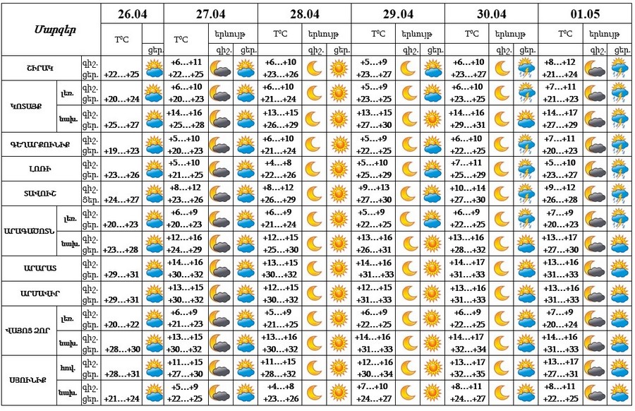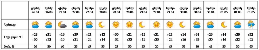 Ապրիլի 26-ի ցերեկը, 27-30-ին սպասվում է առանց տեղումների եղանակ։ Մայիսի 1-ին երեկոյան ժամերին հնարավոր է կարճատև անձրև և ամպրոպ, ամպրոպի ժամանակ քամու ուժգնացում 13-16մ/վ արագությամբ։