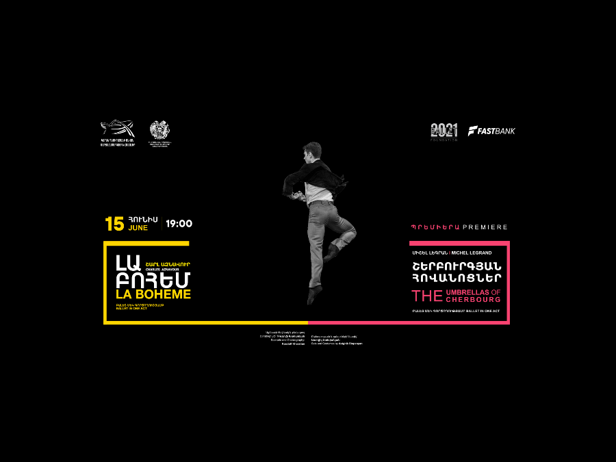 «Բալետ 2021» հիմնադրամի նախաձեռնությամբ և Ֆասթ Բանկի աջակցությամբ հունիսի 15-ին՝ ժամը 19։00-ին Կարեն Դեմիրճյանի անվան մարզահամերգային համալիրում տեղի կունենա Շառլ Ազնավուրի «Լա Բոհեմ» և Միշել Լեգրանի «Շերբուրգյան հովանոցներ» բալետային ներկայացումների առաջնախաղը՝ նախատեսված բոլոր սերունդների ներկայացուցիչների համար։