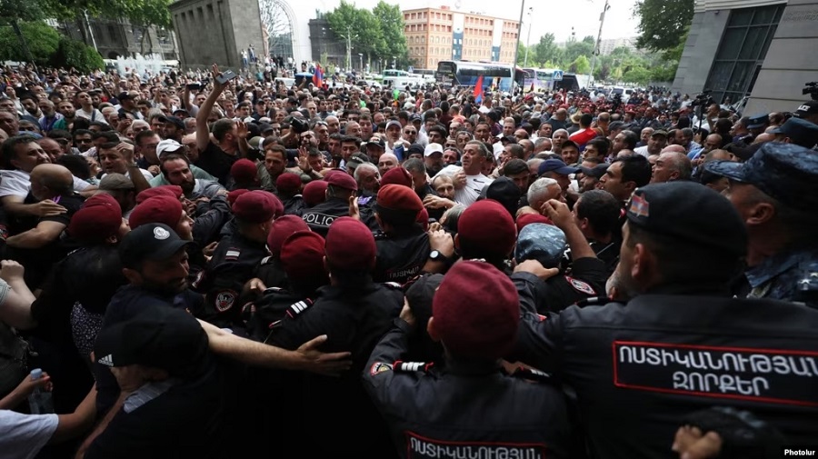 Կաթողիկոս եւ միաբաններ ոստիկանական ջոկատներու դիմաց: