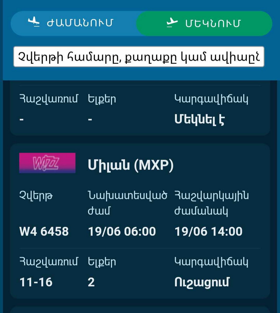 Այսօր վաղ առավոտյան՝ Երեւանի ժամանակով 01:15-ին Wizz.air ավիաընկերության Միլանից Երեւան նախատեսվող թռիչքն արդեն գրեթե ութ ժամ է՝ հետաձգվում է: Մեր հայրենակիցներն ավելի քան տասը ժամ անցկացրել են Միլանի օդանավակայանում՝ առանց որեւէ պայմանների: