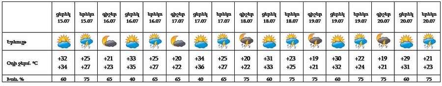 Հուլիսի 15-ին երեկոյան, 16-17-ին գիշերը և երեկոյան քաղաքի առանձին հատվածներում հնարավոր է կարճատև անձրև և ամպրոպ: Հուլիսի 18-20-ին սպասվում է կարճատև անձրև և ամպրոպ։ Ամպրոպի ժամանակ և երեկոյան սպասվում է քամու ուժգնացում` 18-23մ/վ արագությամբ։