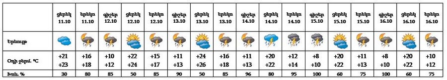 Հոկտեմբերի 11-ին կեսօրից հետո, 12-13-ին, 15-16-ին սպասվում է կարճատև անձրև և ամպրոպ։ Հոկտեմբերի 14-ին ժամանակ առ ժամանակ սպասվում է անձրև և ամպրոպ։