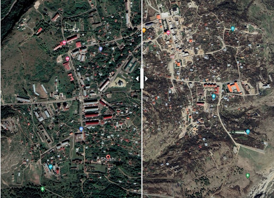 Պատերազմի հետևանքով 2020-ին Ադրբեջանի վերահսկողության տակ անցած Շուշի քաղաքի արբանյակային լուսանկարները բացահայտում են, որ Ադրբեջանը հիմնովին ավերել է քաղաքի մի շարք թաղամասեր և ակտիվ շինարարություն է իրականացնում։