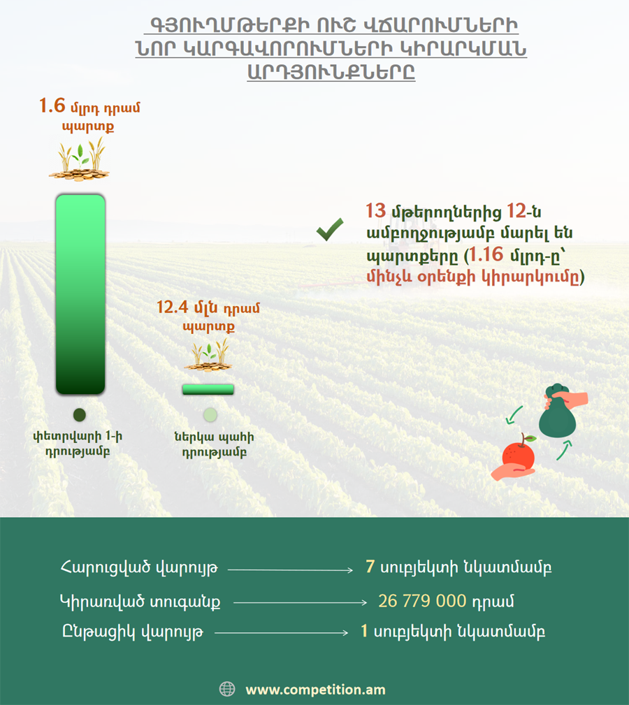 2024 թվականի փետրվարի 1-ի դրությամբ 13 մթերող ընկերություններ ունեցել են գյուղատնտեսական արտադրանքի ավելի քան 1.6 մլրդ դրամի չմարված պարտավորություններ, որոնցից 6-ը առանց վարչարարության՝ իրականացված աշխատանքների արդյունքում, 2024 թվականի հունիսի 7-ի դրությամբ ամբողջությամբ մարել են ունեցած շուրջ 1.16 մլրդ դրամի բոլոր պարտավորությունները:
