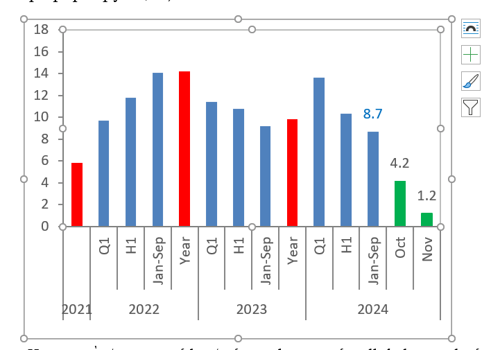 Նոյեմբերին տնտեսական ակտիվության աճի ցուցանիշն իջավ՝ հոկտեմբերի 4․2 տոկոսից կազմելով 1.2 տոկոս (տ/տ՝ տվյալ ժամանակահատվածը՝ նախորդ տարվա նույն ժամանակահատվածի նկատմամբ) (պատկեր 1)։ Նոյեմբերի անկումը հիմնականում պայմանավորված էր 19 տոկոսով արդյունաբերության կրճատմամբ (տ/տ), որի վրա ազդել էին մշակող արդյունաբերության 24.4 տոկոսով (տ/տ) և հանքարդյունաբերության (տ/տ) 6.9 տոկոսով նվազումը։ Մշակող արդյունաբերության թողարկումը հիմնականում նվազեց գունավոր մետաղների արտադրության ծավալների 70 տոկոսով կրճատման հետևանքով։ Մշակող արդյունաբերության մյուս հիմնական խմբերը, ինչպիսիք են՝ սննդամթերքը, ծխախոտը և խմիչքները, շարունակեցին աճել։ Բոլոր մյուս ոլորտներն աճել են՝ ծառայությունները (բացառությամբ առևտրի) կրկնապատկվել են՝ հոկտեմբերի 5.2 տոկոսից (տ/տ) նոյեմբերին կազմելով 10.4 տոկոս (տ/տ)․ շինարարության և առևտրի երկնիշ աճը շարունակվել է։ Աճողական կարգով՝ հունվար – նոյեմբեր ամիսներին աճի ցուցանիշը հասավ 7.4 տոկոսի (տ/տ)՝ պայմանավորված 18 տոկոսով առևտրի աճով (տ/տ)։