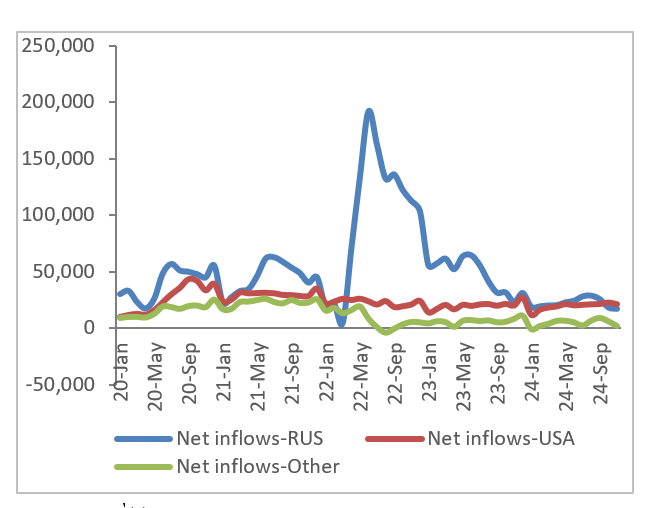 Զուտ ոչ առևտրային դրամական փոխանցումները նոյեմբերին 14.3 տոկոսով նվազեցին (ա/ա՝ տվյալ ամիսը՝ նախորդ ամսվա նկատմամբ)։ Զուտ ներհոսքերը նվազեցին (ա/ա) բոլոր աղբյուրներից, այդ թվում՝ Ռուսաստանից (6.2 տոկոս, ա/ա), Միացյալ Նահանգներից (6.4 տոկոս, ա/ա) և այլ երկրներից (69 տոկոս, ա/ա) (պատկեր 2)։ 2023 թ նոյեմբերի համեմատ զուտ ներհոսքերը 21.7 տոկոսով պակաս էին (տ/տ) հիմնականում Ռուսաստանից զուտ ներհոսքերի նվազման պատճառով։