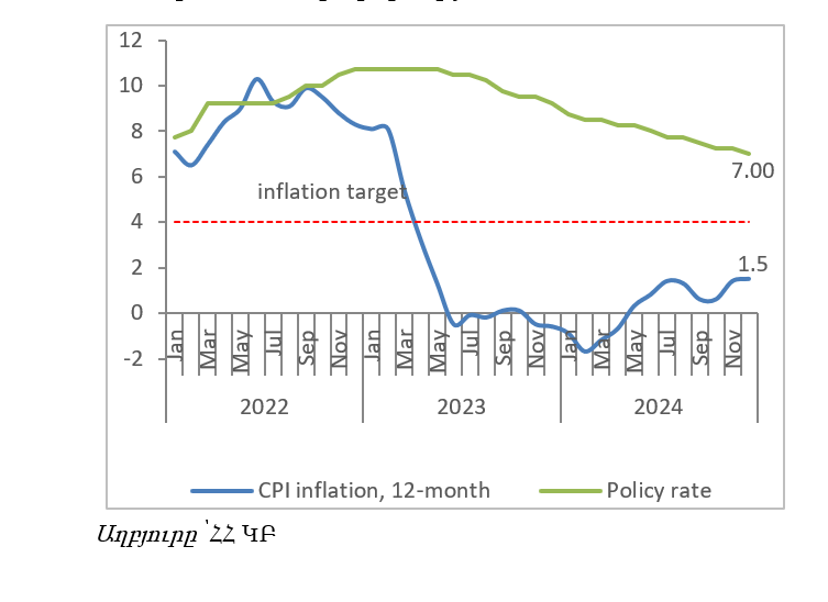 Դեկտեմբերին շարունակեցին նվազել հագուստի և կոշկեղենի (նվազումը՝ 2.6 տոկոս, տ/տ), կահավորանքի և կենցաղային տեխնիկայի (նվազումը՝ 2.5 տոկոս, տ/տ) և բնակարանային-կոմունալ տնտեսության գները (նվազումը՝ 0.2 տոկոս, տ/տ)։ 2024 թ․ միջին գնաճը 0.3 տոկոս էր՝ 2023 թ․ 2 տոկոսի համեմատ։ 2024 թ․ դեկտեմբերին 10-ին ՀՀ ԿԲ խորհուրդը վերաֆինանսավորման (քաղաքականության) տոկոսադրույքը 25 բազիսային կետով իջեցրեց 7 տոկոսի՝ աճողական կարգով 2024 թ․ կրճատումը հասցնելով 225 բազիսային կետի։ Վերաֆինանսավորման տոկոսադրույքը վերադարձել է 2022 թ․ օգոստոսի մակարդակին։