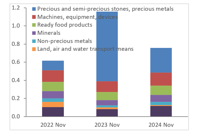 2024 թ․ նոյեմբերին, նախորդ ամիսների բարձր աճից հետո, առևտրաշրջանառությունը նվազեց (տ/տ)։ Արտահանումը նոյեմբերին նվազեց 35 տոկոսով (տ/տ)՝ հոկտեմբերին 23.6 տոկոսով (տ/տ) աճելուց հետո։ Ներմուծումը ևս նվազեց 21.4 տոկոսով՝ հոկտեմբերին 9.2 տոկոսով (տ/տ) ավելանալուց հետո։ Նոյեմբերի կտրուկ անկումը պայմանավորված էր թանկարժեք և կիսաթանկարժեք քարերի արտահանման (նվազումը 64.6 տոկոս, տ/տ) և ներմուծման (նվազումը 70.6 տոկոս, տ/տ) ավելի ցածր ցուցանիշով, որը բացատրվում է վերաարտահանման այս ապրանքախմբի համեմատության բազայի բարձր ազդեցությամբ, որը 2023 թ․ նոյեմբերին սկսել էր շեշտակի աճել։