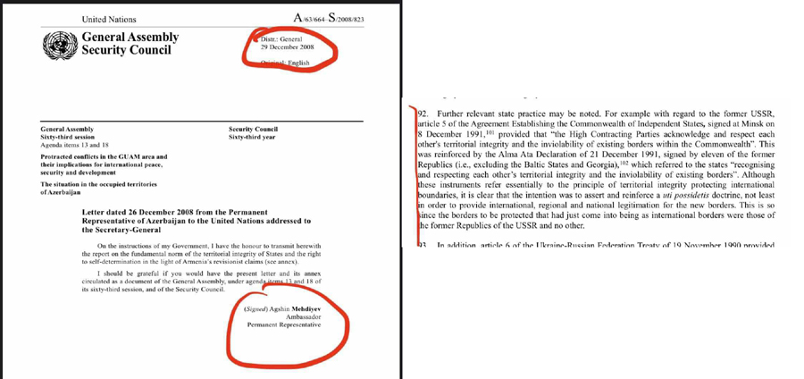 Այսպես՝ ձեզ ներկայացված փաստաթղթում, որը թվագրված է 2008թ. դեկտեմբերի 29, ՄԱԿ-ում Ադրբեջանի մշտական ներկայացուցիչ Աղշին Մեհդիեւը, ՄԱԿ-ի գլխավոր ասամբլեայի օրակարգի շրջանակներում՝ Գուամ տարածքում, սառեցված հակամարտությունների վերաբերյալ քննարկման կապակցությամբ ներկայացնում է նամակ, որով խնդրում է ադրբեջանական հիմնավորումները «Ադրբեջանի տարածքային ամբողջականության մասին» դիտարկել և շրջանառել որպես ՄԱԿ գլխավոր ասամբլեայի փաստաթուղթ: