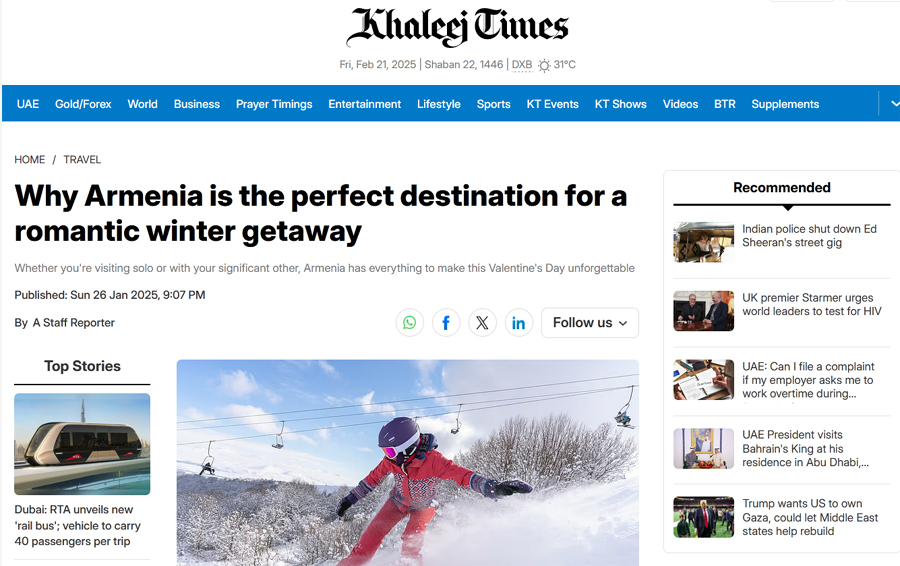 Հ ԷՆ զբոսաշրջության կոմիտեի կողմից տարածված մամուլի հաղորդագրությունը Հայաստանում ձմեռային հանգստի վերաբերյալ, արժանացել է «Khaleej Times» Արաբական Միացյալ Էմիրությունների առաջատար պարբերականի ուշադրությանը։