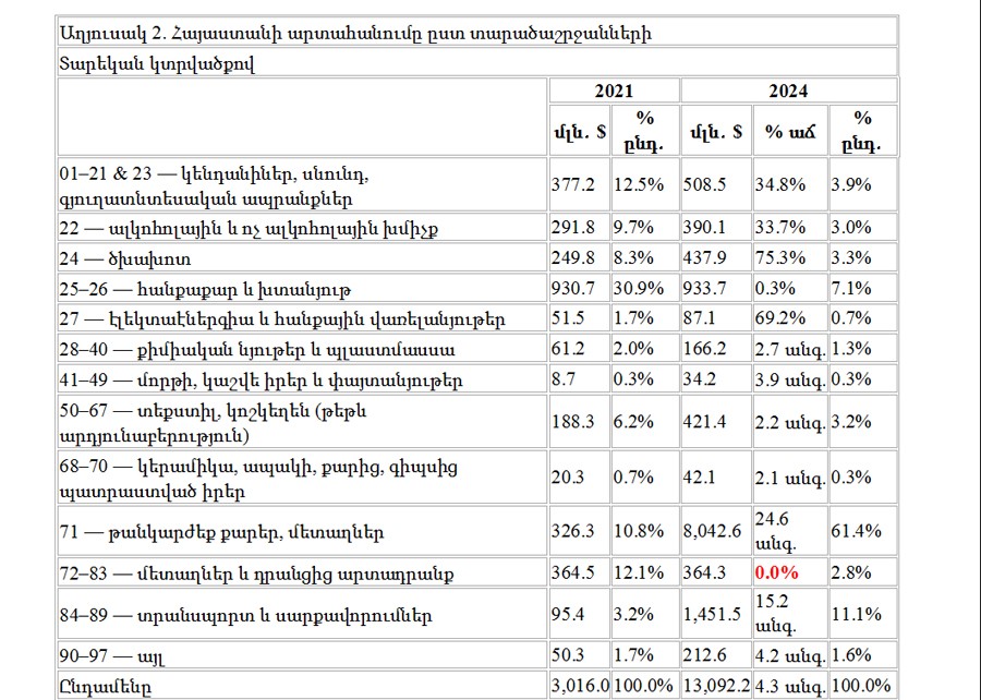 Մինչդեռ Հայաստանի ավանդական արտահանման ոլորտները, ինչպիսիք են մետաղները և դրանցից արտադրանքը (ԱՏԳ ԱԱ 72-83), ցույց են տալիս անփոփոխ կամ նույնիսկ նվազող արդյունքներ: Այս փոփոխությունները հստակորեն վկայում են, որ Հայաստանի արտահանման աճը գլխավորապես պայմանավորված է եղել վերաարտահանման գործունեությամբ, այլ ոչ թե տեղական արտադրության կամ ավելացված արժեքի ավելացմամբ: