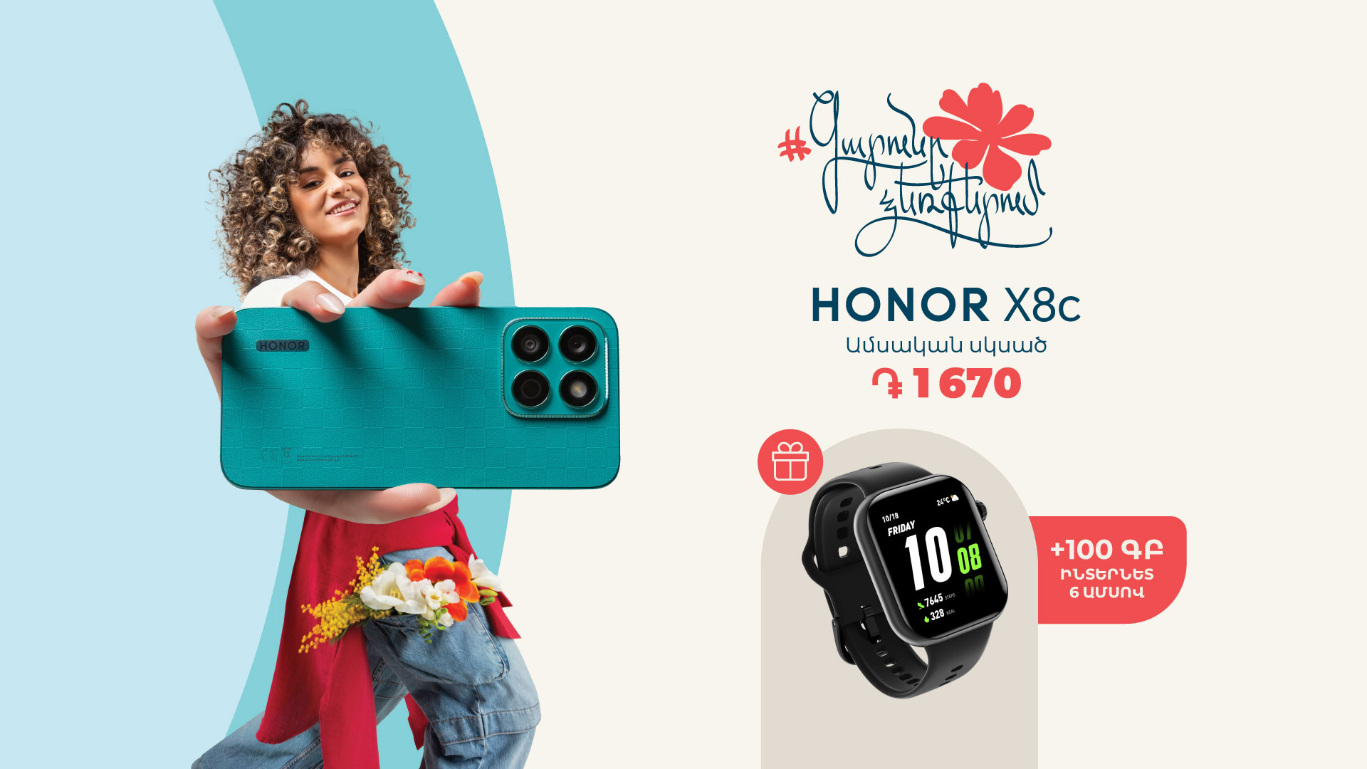 Գարնանային տոներին ընդառաջ հաճախորդները հնարավորություն ունեն ձեռք բերելու այս տարվա արտադրության նորագույն Honor X8c սմարթֆոնը և ստանալ բազմաֆունկցիոնալ Honor Choice Watch 2i սմարթ ժամացույց, հատուկ հեռախոսահամար, Team Tok փաթեթ՝ 1 ամսով և 100 ԳԲ ինտերնետ, որը կարելի է օգտագործել 6 ամսվա ընթացքում: