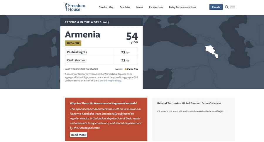 Freedom House միջազգային իրավապաշտպան կազմակերպությունը հրապարակել է «Ազատությունն աշխարհում 2025» տարեկան զեկույցը: Այն նաեւ վերլուծում է Հայաստանում իրավունքների, քաղաքացիական ազատությունների և արդարադատության վիճակը, անդրադառնալով դատական համակարգին, անվտանգությանը, հավասար իրավունքներին և անձնական ազատություններին: Ներկայացնում ենք մեր երկրին վերաբերող հատվածը: