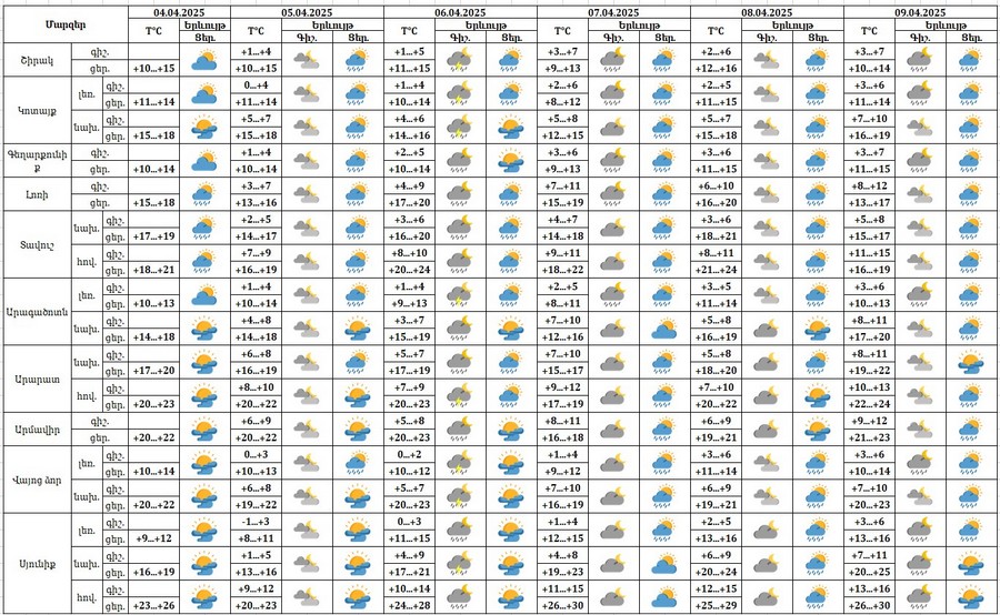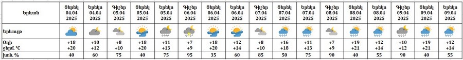 Ապրիլի 4-ի ցերեկը, 5-9-ին` առանձին շրջաններում օրվա ընթացքում սպասվում է կարճատև անձրև, հնարավոր է նաև ամպրոպ։ Քամին՝ հարավարևմտյան՝ 2-5մ/վ: