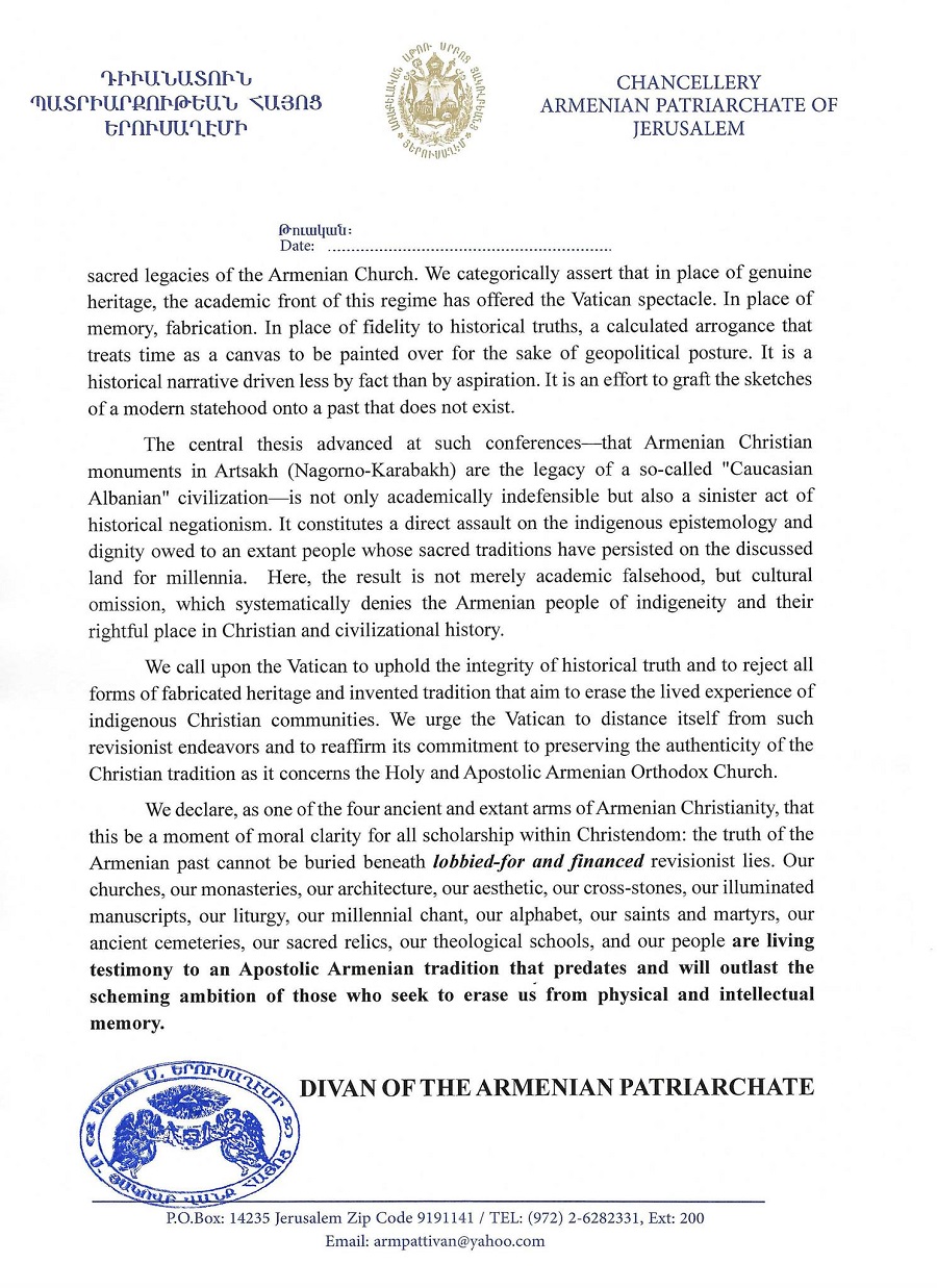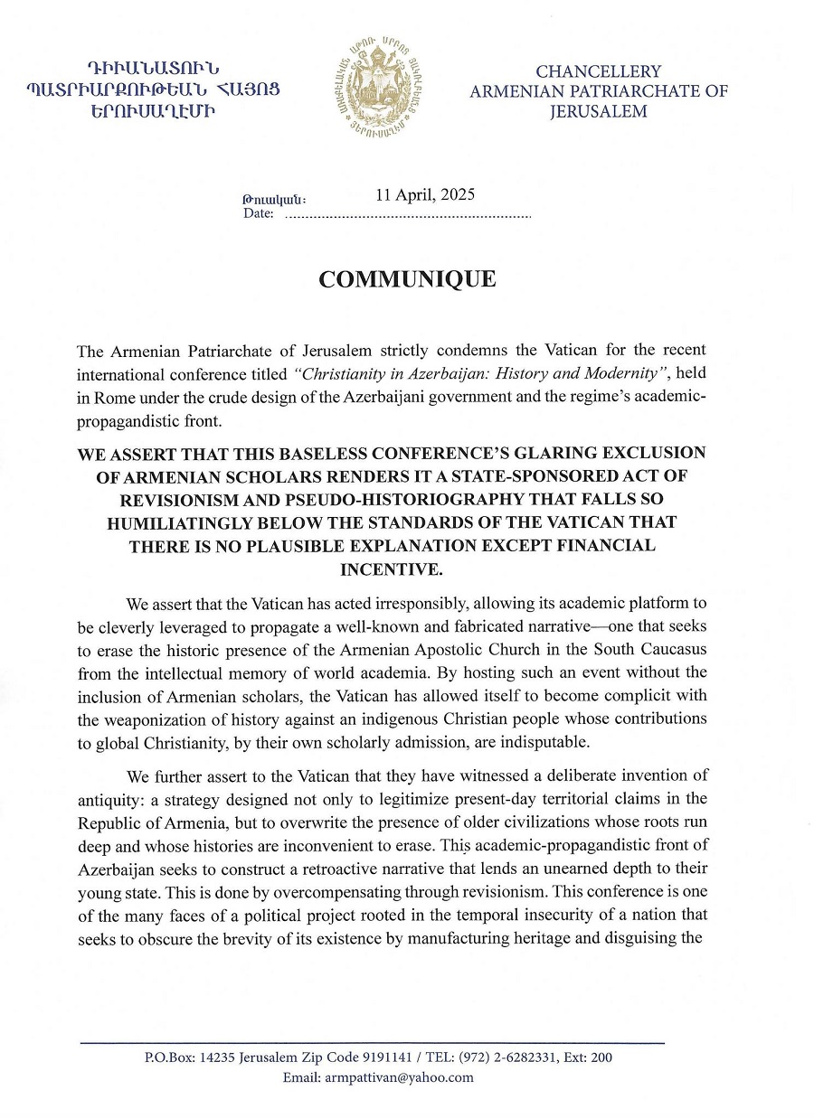 Երուսաղեմի Հայոց Պատրիարքարանը խստորեն դատապարտում է Վատիկանին «Քրիստոնեությունն Ադրբեջանում. պատմություն և արդիականություն» վերնագրով միջազգային համաժողովի համար, որը կայացել է Հռոմում Ադրբեջանի կառավարության և ռեժիմի ակադեմիական-քարոզչական ճակատի կոպիտ նախագծի ներքո։
