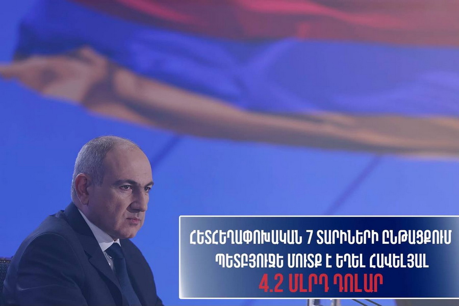 Ըստ նրա, 2018-ի հեղափոխությունը ՀՀ բյուջեի աճին տեմպ է տվել եւ ՔՊ-ի իշխանության յոթ տարիների ընթացքում ՀՀ պետբյուջե լրացուցիչ մուտք է եղել 4,2 միլիարդ դոլար գումար։ Այս թվի մեջ Նիկոլ Փաշինյանը չի հաշվառել պետական պարտքը, «Հայաստան» հիմնադրամի 2020-ին փոխանցած գումարները, քովիդի համավարակի համար ստացված գումարները։