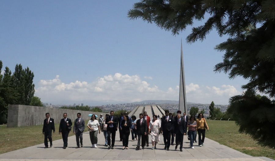 Հյուրերին դիմավորեց Հայոց ցեղասպանության թանգարան-ինստիտուտի տնօրեն Էդիտա Գզոյանը և ուղեկցեց դեպի Հայոց ցեղասպանության հուշահամալիր՝ ներկայացնելով հուշահամալիրի ստեղծման պատմությունը: ՀՑԹԻ տնօրենն անդրադարձ կատարեց նաև Ծիծեռնակաբերդի տարածքում անցյալ դարավերջին Ադրբեջանի Սումգայիթ, Կիրովաբադ (Գանձակ), Բաքու քաղաքներում ադրբեջանական կառավարության կազմակերպած կոտորածներին զոհ գնացած հայերի հիշատակին տեղադրված երեք խաչքարերի և Արցախյան գոյամարտի տարիներին Հուշապատի դիմացի հատվածում հուղարկավորված հինգ ազատամարտիկների պատմություններին՝ շեշտելով կապը տեղի ունեցածի և Հայոց ցեղասպանության միջև: