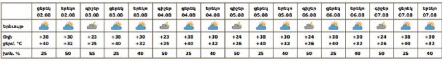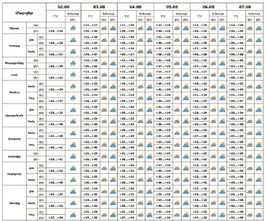 Հարավից արևադարձային տաք օդի ալիքի ներթափանցմամբ պայմանավորված՝ օգոստոսի 2-7-ին Արարատյան դաշտում, Վայոց ձորի նախալեռներում, Սյունիքի հովիտներում և Երևանում սպասվում է բարձր ջերմային ֆոն․ ցերեկը ժամը 16։00-17-00- ն ընկած ժամանակահատվածում՝ +39․․․+41 աստիճան տաքություն։