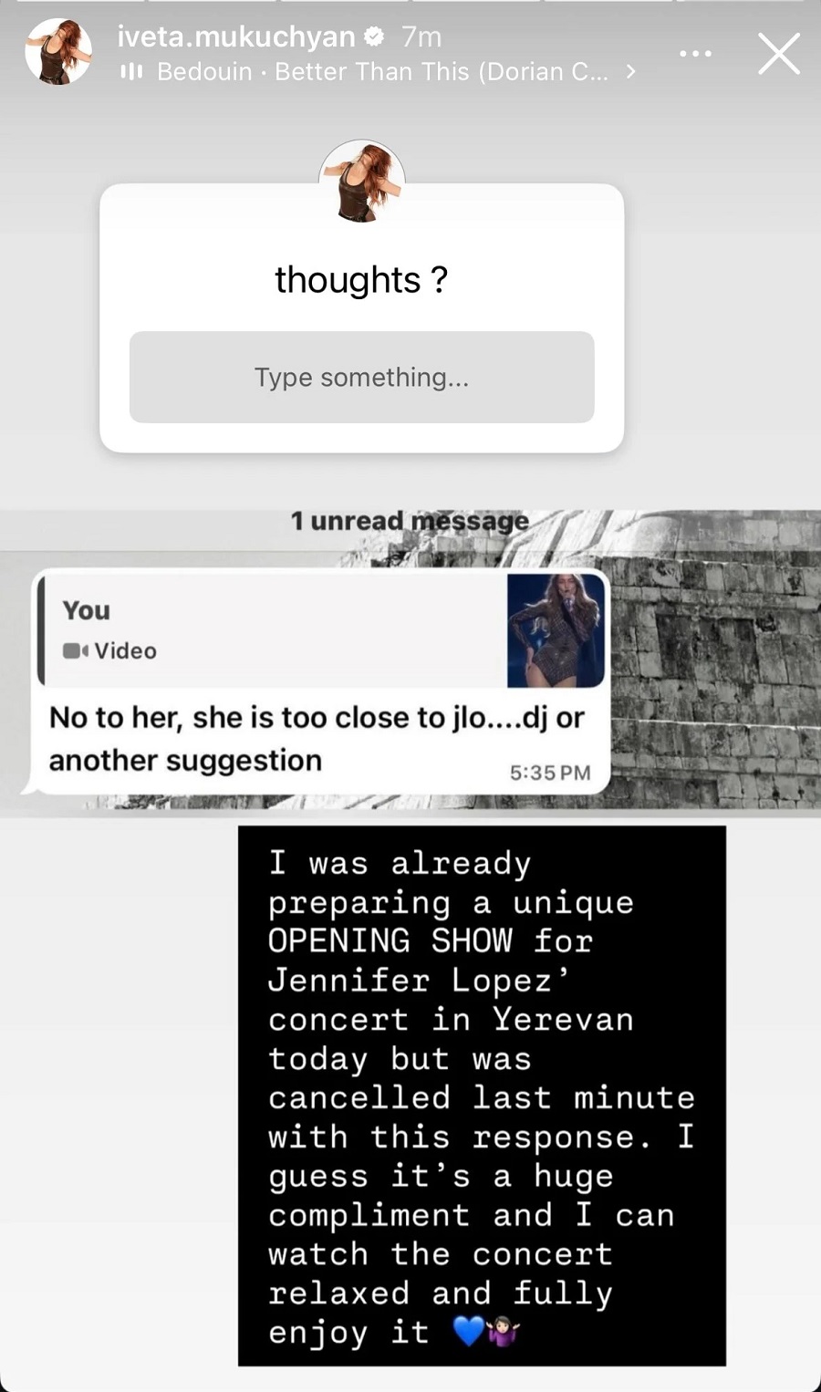 Ինստագրամյան «սթորի» բաժնում հայ երգչուհի Իվետա Մուկուչյանը, որը պատրաստվում էր Ջենիֆեր Լոպեսի համերգի բացմանը, ներկայացրել է Ջենիֆերի թիմի պատասխանն ու գրել իր մեկնաբանությունը.