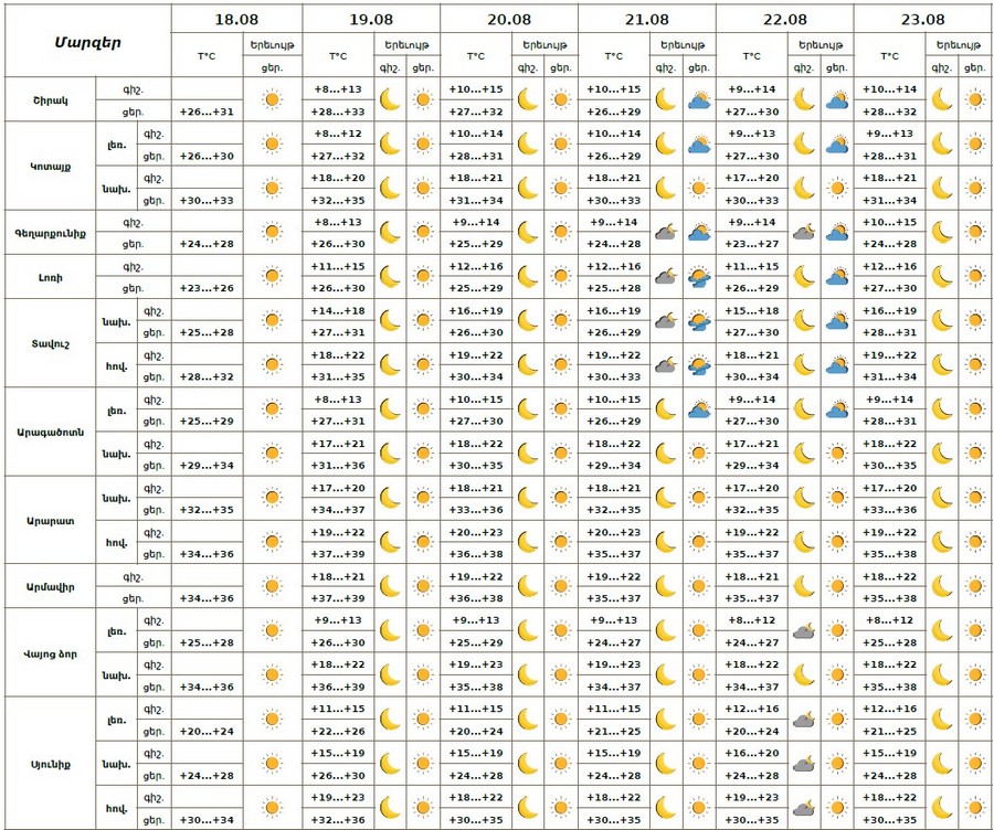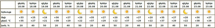 Օդի ջերմաստիճանն օգոստոսի 18-ի ցերեկը, 19-ին աստիճանաբար կբարձրանա 4-6 աստիճանով, Լոռիում, Տավուշում և Սյունիքում՝ 8-10 աստիճանով: