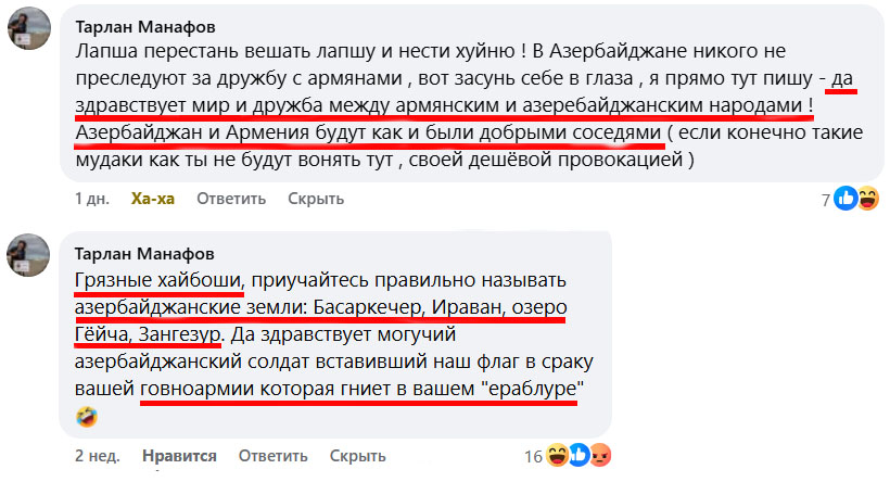 Գիտե՞ք, թե ինչն է ամենատխուրը։ Ուրախ և միամիտ հայերն իրենք են «սրտիկներ» ու «լայքեր» դնում այս նույն ալիևյան ադրբեջանցիների գրառումներին, որոնք երկու շաբաթ առաջ հրապարակավ նվաստացնում էին ձեր ժողովրդին ու պղծում Եռաբլուրում ձեր հերոսների հիշատակը։