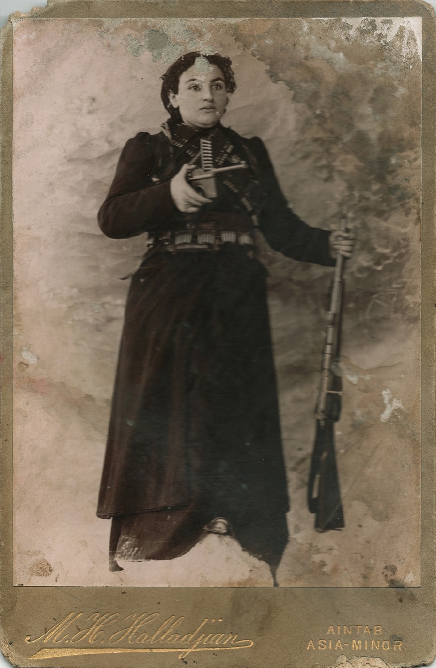 Լուսանկարում Հեղինե Չաուշի մի ձեռքում ատրճանակ է, մյուսում՝ հրացան, կրծքին և գոտկատեղին կապված են փամփշտակալներ։
