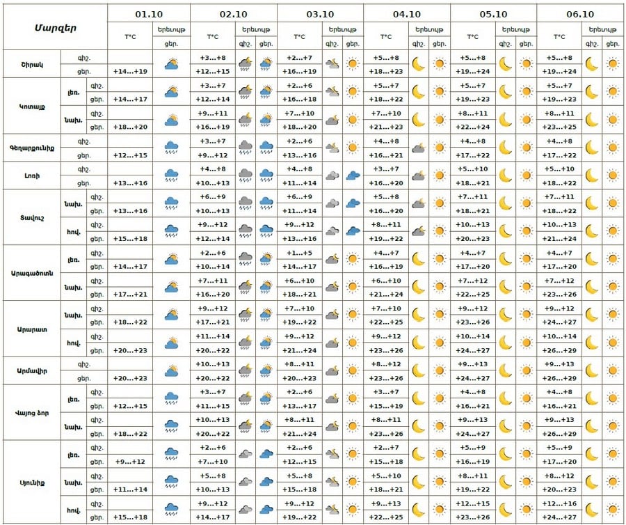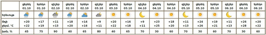 Քամին՝ արևմտյան՝ 2-5մ/վ։ Օդի ջերմաստիճանը հոկտեմբերի 1-ցերեկը, 2-ին աստիճանաբար կնվազի 5-8 աստիճանով, հոկտեմբերի 3-6-ին աստիճանաբար կբարձրանա 8-10 աստիճանով։