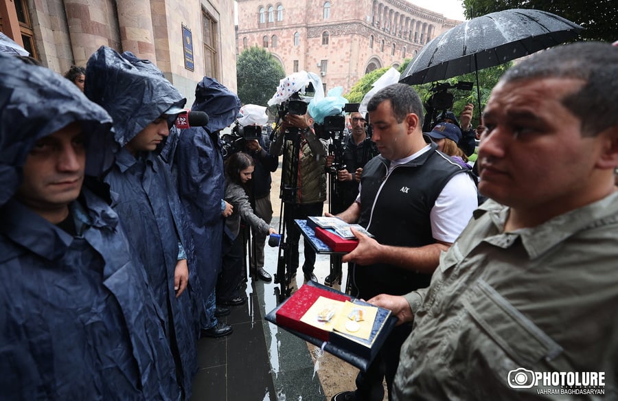 -Այսօր հանձնելու եմ իմ՝ Գարեգին Նժդեհ մեդալը, որով պարգեւատրվել եմ 44-օրյա պատերազմի ժամանակ մարտական գործողությունների մասնակցելու համար: Ինչպես բոլորս տեսնում ենք, այս իշխանությունները հետեւողականորեն իմաստազրկում են այն բոլոր արժեքները, որոնց համար պայքարել ենք ու այս մեդալները ստացել ենք; Այս քայլով ուզում ենք ցույց տալ, որ հաշտ չենք դրա հետ: Չնայած մեր շքանշանները, մեր պայքարը շատ մեծ արժեք ունեն մեզ համար, բայց դրանց հիմքում դրված ավելի մեծ արժեքները, որոնք խորհրդանիշով արտահայտված չեն, այլ մեր սրտերում են, ոտնահարվում են այսօր: Մենք դուրս ենք գալիս մեր պայքարածի արժեզրկման դեմ,- շարունակեց պատերազմի մեկ այլ մասնակից՝ Հայկ Նավասարդյանը: