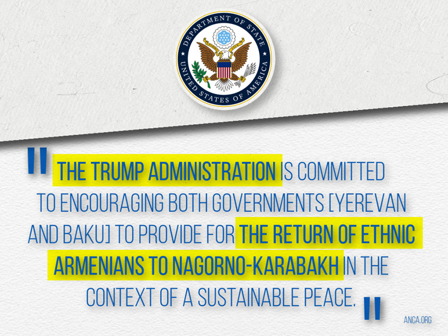 ԱՄՆ հայ դատի հանձնախումբը (ANCA) ողջունում է ԱՄՆ նախագահ Թրամփի վարչակազմի հանձնառությունը՝ «ապահովելու Արցախի փախստականների վերադարձը, հայկական գերիների ազատ արձակումը և քրիստոնեական սրբավայրերի պաշտպանությունը»: