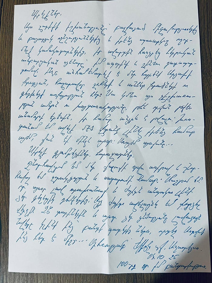 Շնորհավորում եմ մեր քաղաքի օրվա առիթով եւ շնորհակալ եմ զորակցության եւ սատարումի համար: Մաղթում եմ, որ այսօր լավ ուրախանաք եւ ժպիտն անպակաս լինի ձեր գեղեցիկ դեմքերից: Այդ ժպիտը ավելացնել եմ փորձել վերջին 26 տարիներին եւ այսօր ձեր ցնծությունը լավագույն նվերը կլինի ինձ՝ բանտի պատերից ներս, որտեղ Աստված ինձ հետ է միշտ…