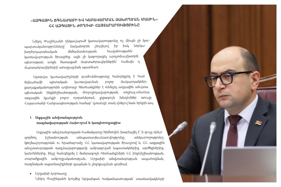 «Այս փաստերը կարելի է շարունակել, բայց հայտարարության մեջ ներկայացված են ամենաաղաղակող եւ ամենացավոտ հարցերը»,- ԱԺ պետաիրավական հարցերի հանձնաժողովի նիստում ասաց «Պատիվ ունեմ» խմբակցության ղեկավար Հայկ Մամիջանյանը։ Նա ներկայացնում էր «Ազգային ճգնաժամի եւ կառավարման ձախողման մասին» ԱԺ հայտարարության նախագիծը: