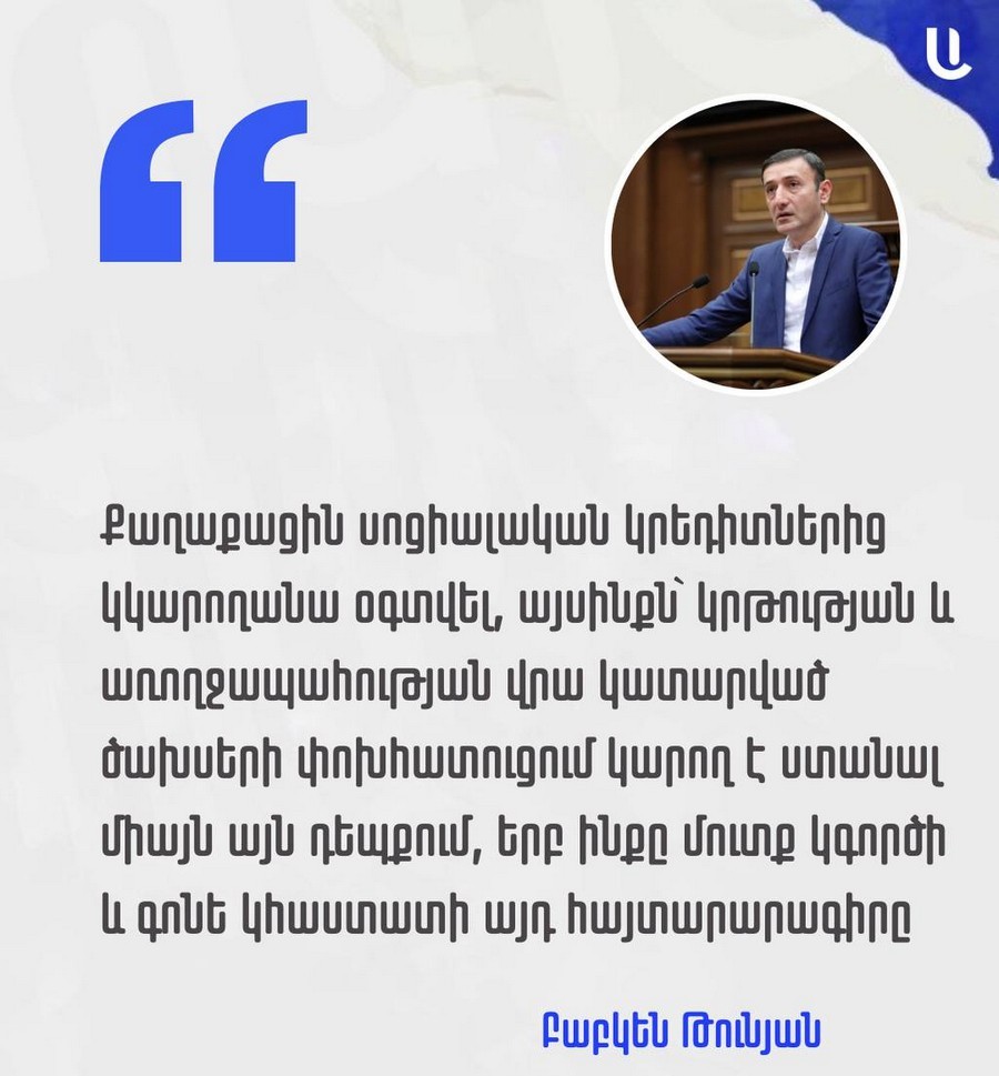 «Սա արվում է մարդկանց կյանքը հեշտացնելու համար: Մենք պատժիչ տրամաբանությունից անցնում ենք մոտիվացիոն տրամաբանությանը, որովհետև հայտարարագիր չլրացնելու համար փաստացի պատասխանատվություն չի լինում, որովհետև նման դեպքեր էլ չեն լինում: Բայց քաղաքացին սոցիալական կրեդիտներից կկարողանա օգտվել, այսինքն՝ կրթության և առողջապահության վրա կատարված ծախսերի փոխհատուցում կարող է ստանալ միայն այն դեպքում, երբ ինքը մուտք կգործի և գոնե կհաստատի այդ հայտարարագիրը»,-ասաց Թունյանը: