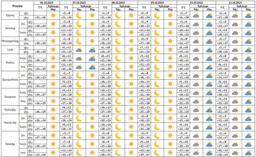 Օդի ջերմաստիճանը հոկտեմբերի 6-ի ցերեկը, 7-8-ին աստիճանաբար կբարձրանա ևս 2-3 աստիճանով: