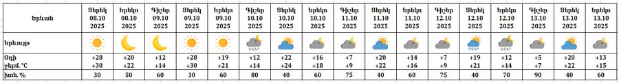 Հոկտեմբերի 8-ի ցերեկը, 9-ին, 11-ին , 12-ի գիշերը, 13-ին սպասվում է առանց տեղումների եղանակ։