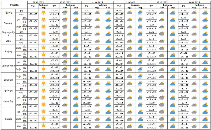 Հոկտեմբերի 9-ի և 10-ի ցերեկը, 11-ին, 12-ի գիշերը, 13-14-ին սպասվում է առանց տեղումների եղանակ։