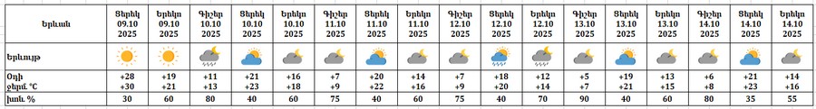 Հոկտեմբերի 9-ի և 10-ի ցերեկը, 11-ին, 12-ի գիշերը, 13-ի ցերեկը, 14-ին սպասվում է առանց տեղումների եղանակ։ Հոկտեմբերի 10-ի գիշերը, 12-ի ցերեկը, 13-ի գիշերը առանձին շրջաններում սպասվում է կարճատև անձրև։